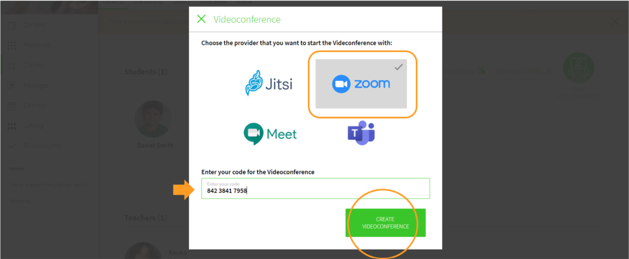 Select Zoom. paste the meeting ID and click on CREATE VIDEOCONFERENCE