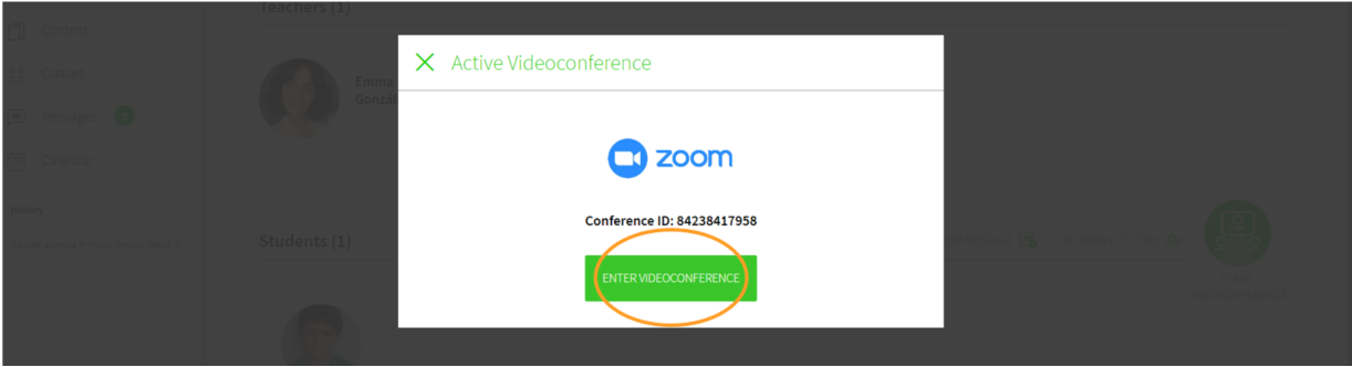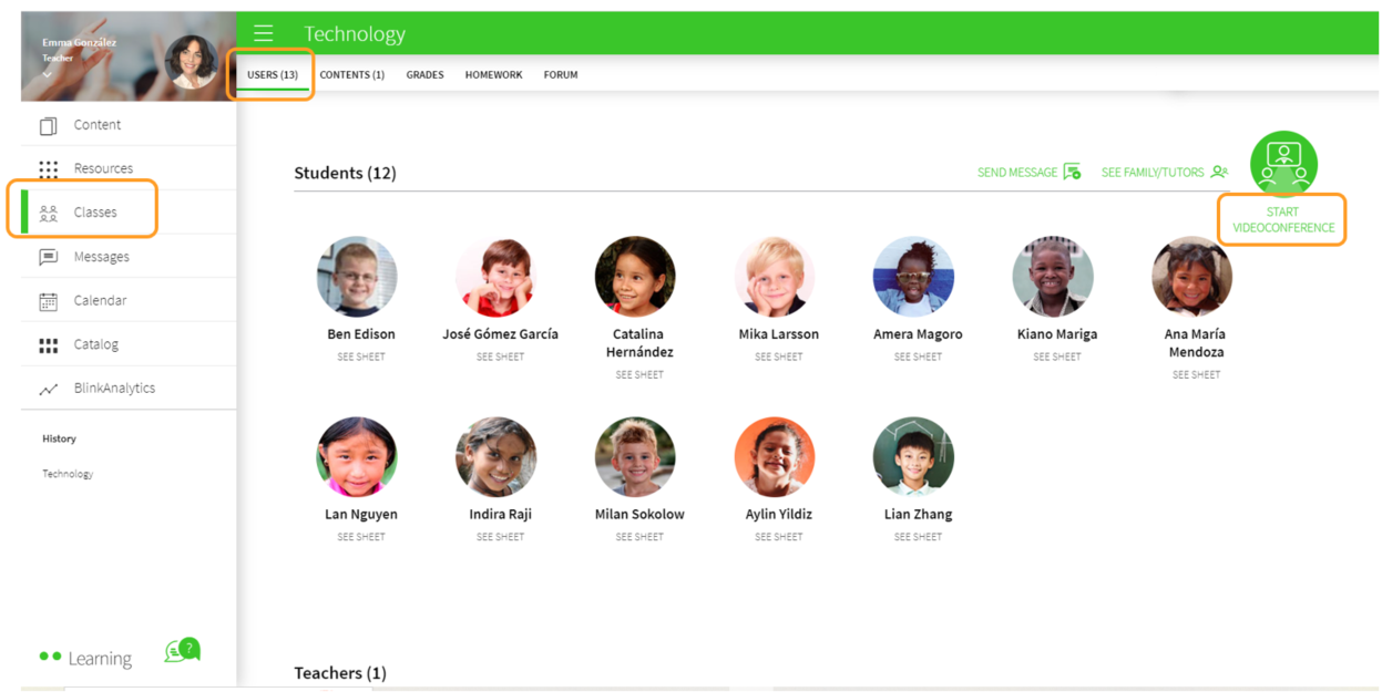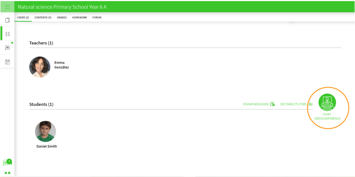 To do this, go to the Classes section, under the USERS tab and verify that you have a class created with your students. Then click on START VIDEOCONFERENCE
