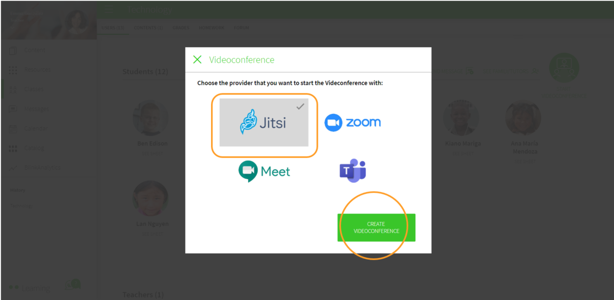 1- TEACHER: Select the Jitsi option and then click on CREATE VIDEOCONFERENCE