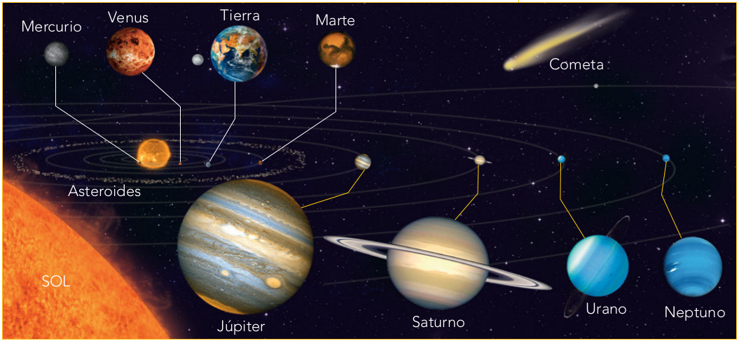 Como otras estrellas, el Sol ilumina y calienta a un grupo de objetos mucho menores, que giran a su alrededor. Son: