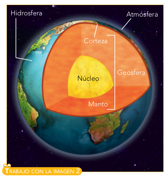 • La geosfera, que es la bola de roca y metal que quedaría si quitáramos las otras partes. Es visible donde no la cubren el agua o las plantas y se ve marrón.