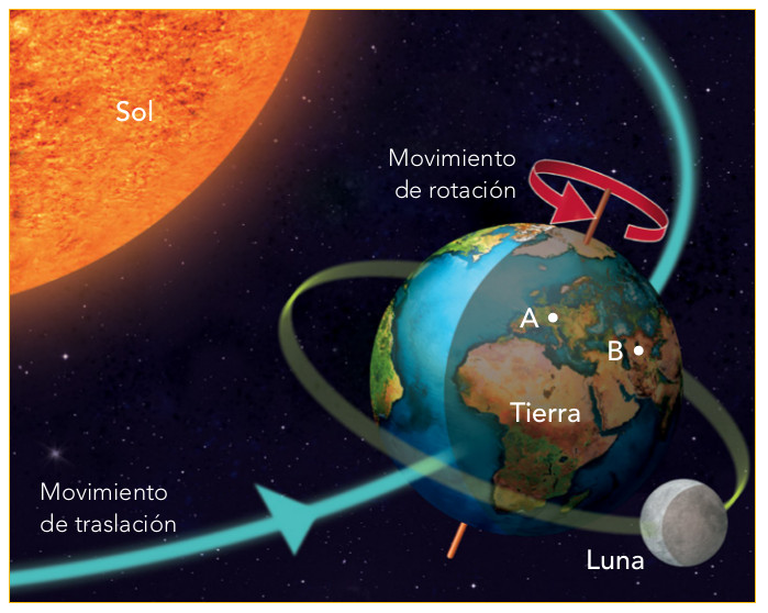 En los puntos A y B de la Tierra no ven el Sol. Allí es de noche. Pero como la Tierra realiza la rotación, en esos puntos amanecerá y se verá el Sol.