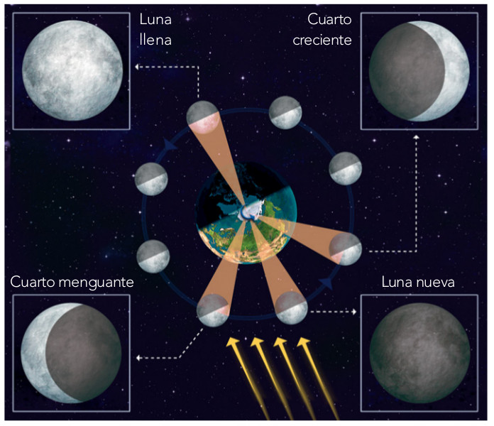 Las fases lunares se suceden una y otra vez en este orden: cuarto creciente, luna llena, cuarto menguante y luna nueva.