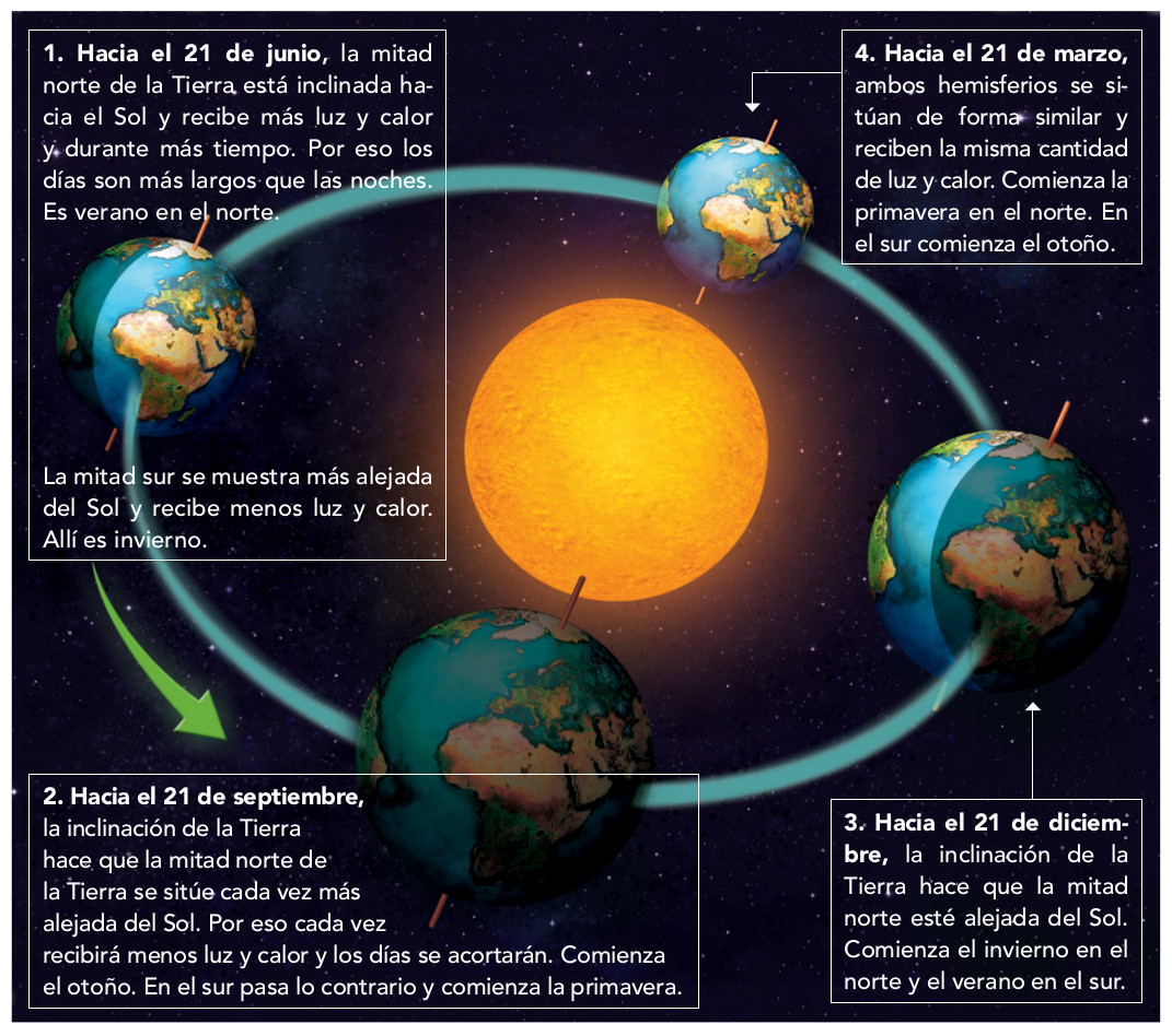 La Tierra está inclinada mientras gira alrededor del Sol. Eso hace que cada zona del planeta reciba más luz y calor y durante más tiempo en unas épocas del año que en otras.