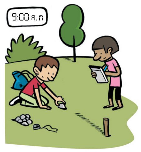 Bea y Jon están haciendo este experimento en una zona despejada de su localidad. En los dibujos puedes ver lo que fueron haciendo y los resultados que obtuvieron.
