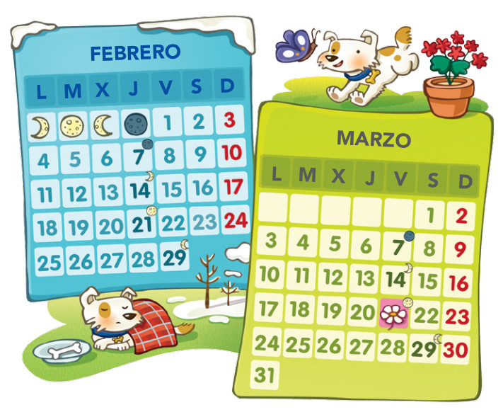 1. Observa el calendario ilustrado en esta página. Contiene mucha información: los días festivos, las fases de la Luna... Utiliza esa información y responde: