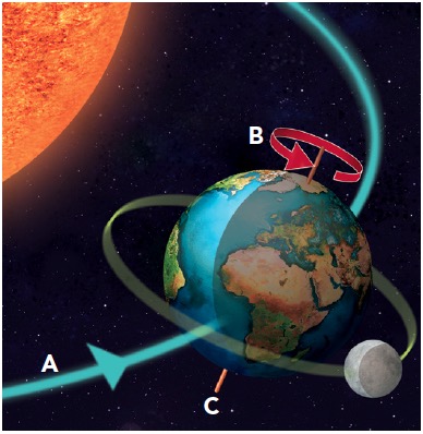 Al mismo tiempo que gira sobre su eje, la Tierra se traslada alrededor del Sol. El recorrido, que se llama órbita, tiene una forma casi circular.