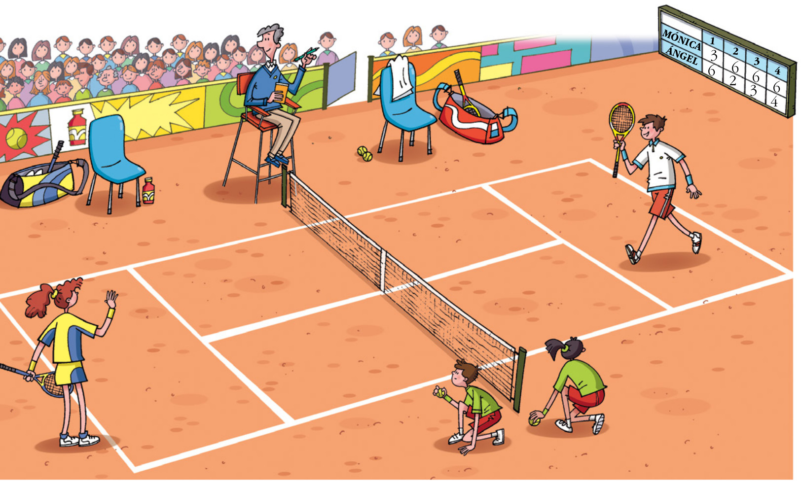 El sábado pasado, Mónica y Ángel disputaron un partido de tenis a cinco sets en la pista del polideportivo de La Pinilla, recientemente construida. La pista mide 23,87 metros de largo y 8,23 de ancho. El partido, seguido por numeroso público, terminó con la clara ventaja de puntos a favor de Mónica, quien fue felicitada por su contrincante.