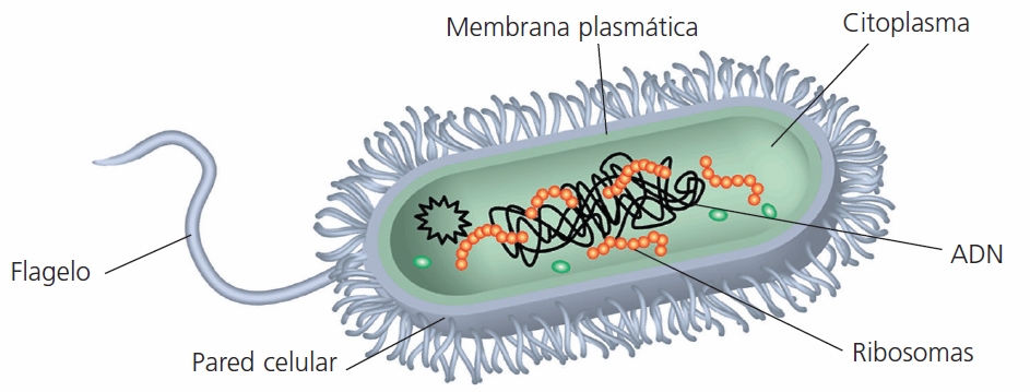 El citoplasma está delimitado por la membrana plasmática, que, a su vez, está rodeada por una pared celular que protege a la célula. También pueden poseer uno o varios flagelos, que utilizan para la locomoción.