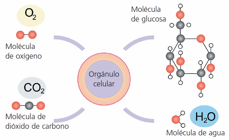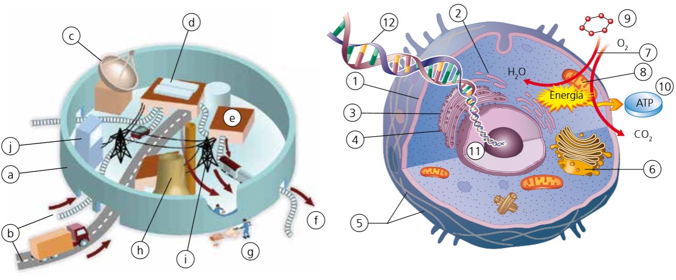 La central energética (h) representa las mitocondrias (8), donde se llevan a cabo reacciones metabólicas parecidas a las combustiones. En presencia de oxígeno se rompen los hidratos de carbono y las grasas (9), se forma dióxido de carbono y se desprende energía (10).
