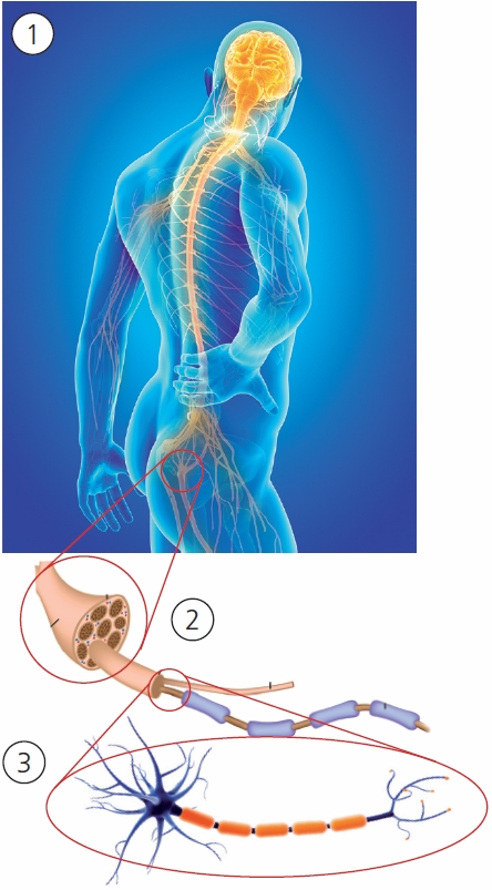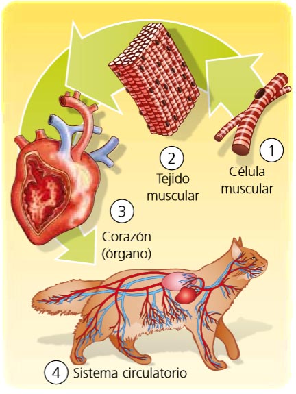 Niveles de organización de un ser vivo (gato). Está formado por células (1) agrupadas en tejidos (2), que se asocian en órganos (3) y estos en sistemas (4).