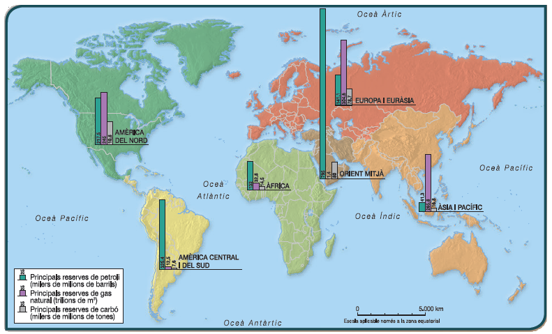 • Quins continents tenen més quantitat de reserves de carbó, petroli i gas natural?