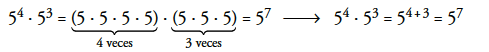 Para multiplicar dos potencias de la misma base, se suman los exponentes.
