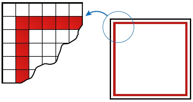 1. El suelo de una habitación cuadrada está enlosado con 484 baldosas de 15 cm de lado. Son todas blancas, excepto las que están a 15 cm de la pared, que forman un marco decorativo de color rojo como se ve en este dibujo: