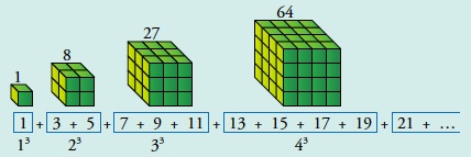 • En la suma de los números impares, encontramos la suma de los números cúbicos: