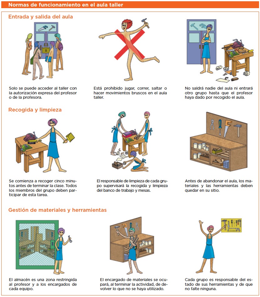 - ¿En qué zona del aula taller deberían encontrarse los siguientes objetos: alambre, tenazas, polímetro, catálogos, escofina, brocha, sierra eléctrica de marquetería, pistola de pegamento termofusible?