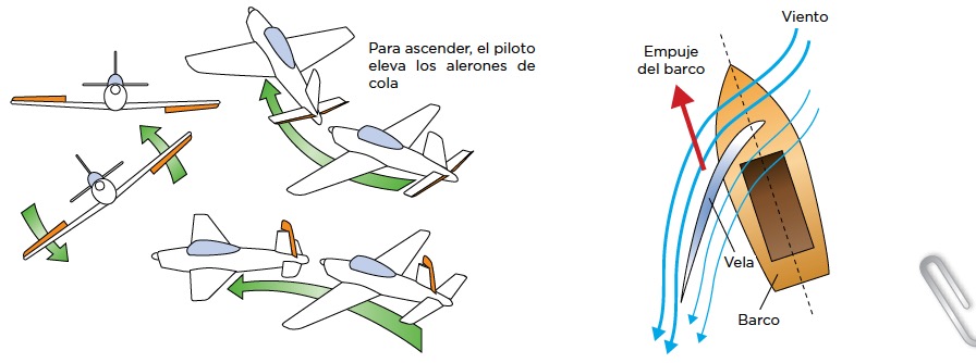 El ala de un avión y la vela de un barco tienen mucho en común. Al igual que en el avión, las velas obligan a que el aire circule a distintas velocidades por sus dos caras: la mayor velocidad en la cara de sotavento de la vela produce una depresión que provoca que el barco avance, deslizándose hacia adelante.