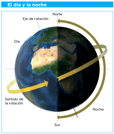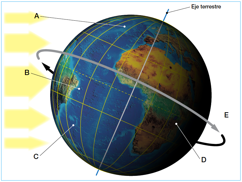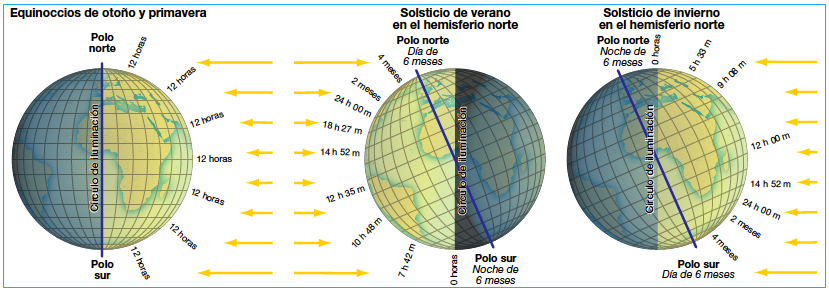 de primavera y de otoño, el círculo de iluminación coincide con el eje terrestre, y el día y la noche duran igual en toda la Tierra.