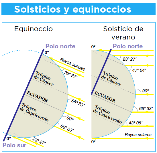 En los equinoccios, los rayos solares caen perpendiculares en el ecuador. Por eso, el día y la noche duran igual en los dos hemisferios.