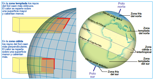 - La existencia de zonas térmicas. Se debe a la distinta inclinación de los rayos solares en cada zona, pues calientan más o menos según caigan perpendiculares, o más o menos inclinados.