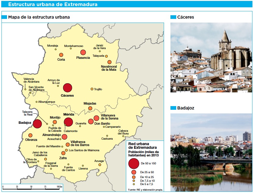 La creación, en el siglo XVIII, en Cáceres, de la Real Audiencia de Extremadura (sede de la Administración Regional de Justicia) y la decisión de convertir en capitales provinciales a Cáceres y a Badajoz a mediados del siglo XIX explican que estos dos núcleos de población se transformaran en las dos ciudades más pobladas de la región.