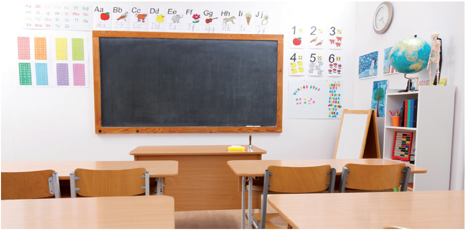 Dans la classe il y a tables, chaises, bureau,  tableau, globe, horloge, étagères et posters.