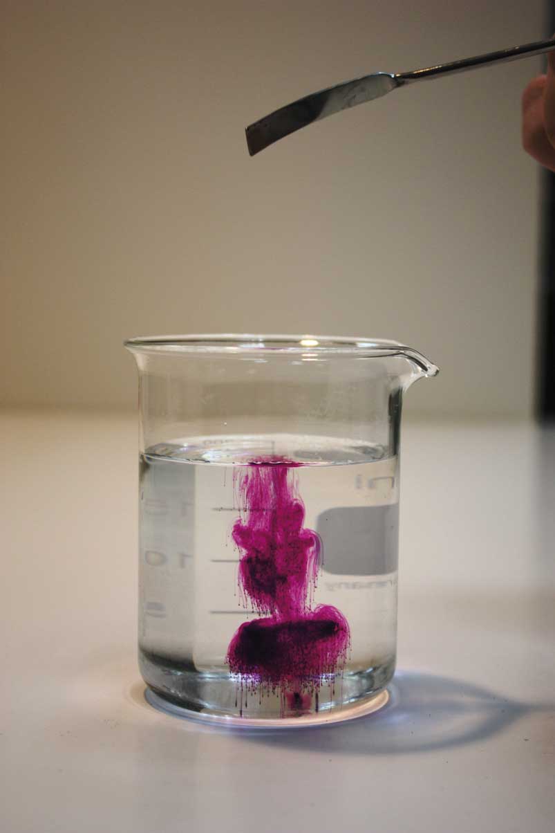 In the lab, we put a small amount of potassium permanganate into a beaker of water. Look at the photos to see what happens. In the top row, the water in the beaker is cold and in the bottom row, the water is hot.