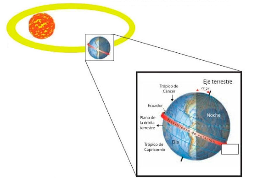 Debido a esta inclinación, los rayos del Sol llegan perpendicularmente hasta los trópicos, como lo puedes observar en el esquema de la página 14, ya sea al norte o al sur del ecuador de acuerdo con la estación del año, la cual también se determina por la traslación terrestre.