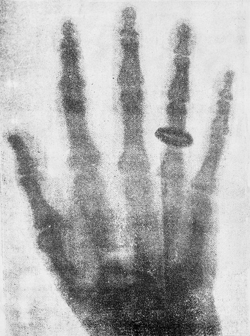 Roentgen pidió a su mujer que colaborase con él en el experimento. Expuso su mano a la acción de los rayos X y pudo observar por primera vez los huesos de una persona viva. ¡Había obtenido la primera imagen del interior del cuerpo humano!