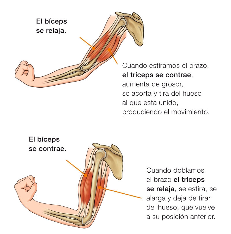 Por ejemplo, en la articulación del codo, el bíceps y el tríceps son músculos antagonistas. Cuando uno de ellos está contraído, el otro está relajado y viceversa.
