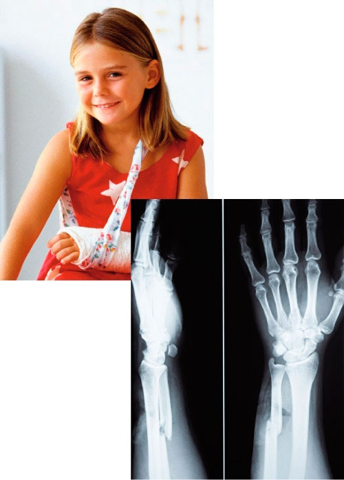 • Las fracturas. Se producen por la rotura de un hueso, que puede partirse o astillarse. El tratamiento más habitual consiste en colocar una escayola o una tablilla que mantiene el hueso en la posición correcta hasta que se repara. Si la fractura es complicada, se pueden colocar clavos o placas metálicas.