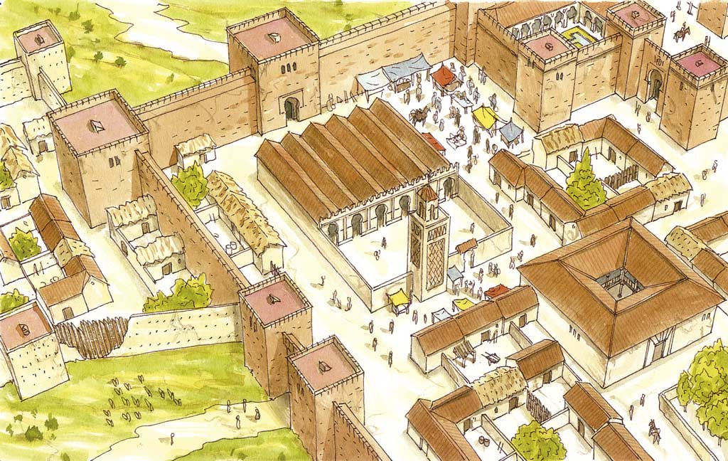La medina, era la parte central de la ciudad y estaba amurallada. En su interior se localizaban construcciones religiosas como la mezquita principal o mezquita mayor, y la madraza, escuela donde se estudiaba el Corán; construcciones civiles como el zoco o mercado, donde se realizaban los intercambios comerciales; los baños públicos, la alhóndiga (donde se almacenaba y se comercializaba con cereales); los barrios de viviendas, caracterizados por las calles estrechas y un trazado irregular; los barrios específicos para judíos (llamados juderías ) y para cristianos. Construcciones mi-litares como la alcazaba o palacio fortificado que estaba protegido por una guarnición de soldados.