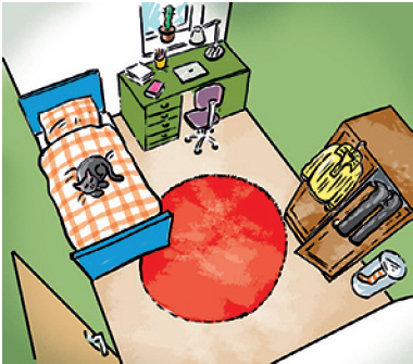 Fabian liebt Farben. Sein Zimmer hat zwei und zwei Wände. Auf dem Boden liegt ein Teppich. Der Schrank ist sehr alt. Am Schrank hängen eine Hose und ein Pullover. Fabian hat ein Bett. Auf dem Bett liegt eine Katze. Neben dem Bett steht der Schreibtisch.