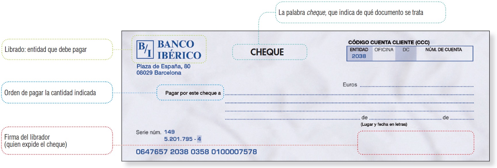 El cheque es un documento mediante el cual el cliente (librador) ordena pagar a una entidad bancaria (librado) una cantidad determinada de dinero a otra persona (tenedor).