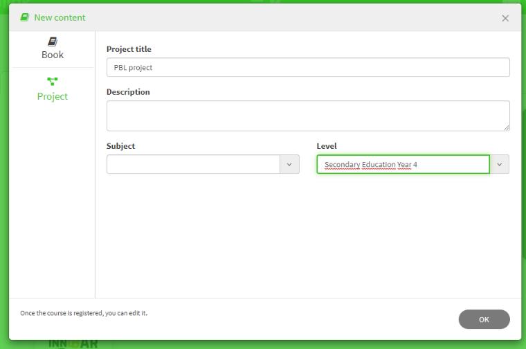 2. Select Project and complete the required fields: Project title, description (optional), Subject and Level. Next, click on Ok and the project’s structure will be created.