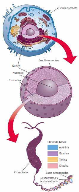 Núcleo. Cuando el cromosoma se despliega como una cinta, se ve que el ADN está formado por dos largas cadenas entrelazadas en forma de doble hélice, cada una compuesta por cuatro tipos de subunidades, llamadas bases nitrogenadas, que están unidas a un soporte de desoxirribosa y ácido fosfórico.