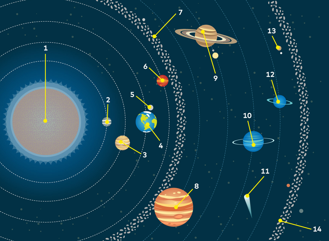 Escribe el nombre de cada uno de los astros y regiones del sistema solar señalados en el esquema.