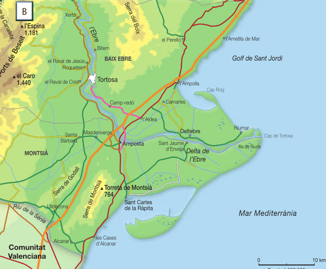Font 21. L'escala gràfica d'aquests dos mapes té la mateixa longitud (2 cm), però representa distàncies diferents. En el mapa A, els 2 cm representen 20 km i en el ma-pa B, 10 km. Si mesurem la distància entre dos punts del mapa i després col·loquem aquesta mida sobre el segment de l'escala tantes vegades com calgui, sabrem la distància real en quilòmetres entre els dos punts. Així, per exemple, si mesurem la distància entre Tortosa i Deltebre en el mapa A, veiem que és de 2 cm, la qual cosa indica que la distància real en línia recta entre aquestes dues poblacions és de 20 km. I si mesurem la distància que hi ha entre Reus i el Perelló en el mateix mapa, veiem que és de 4 cm; això vol dir que la distància real en línia recta entre aquestes dues localitats és de 40 km.