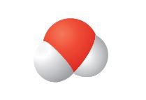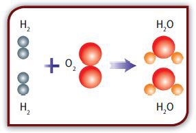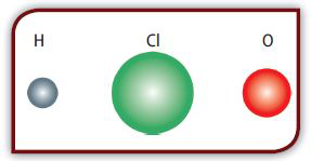 Representació d’un àtom d’hidrogen (H), un àtom de clor (Cl) i un àtom d’oxigen (O). Representació amb models moleculars de la reacció d’obtenció d’aigua (H2O) a partir d’hidrogen (H2) i oxigen (O).