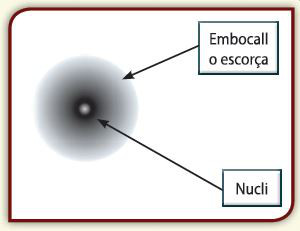 Actualment sabem que els àtoms són molt petits i divisibles, és a dir, que estan formats per partícules encara més petites anomenades partícules subatòmiques. Les més importants són els protons, els neutrons i els electrons. Aquestes partícules es troben disposades en tots els àtoms de la manera següent: els protons i els neutrons formen un petit espai central de l’àtom anomenat nucli, i al seu voltant hi ha una altra zona, l’embolcall o escorça, en la qual hi ha els electrons, que es mouen constantment.