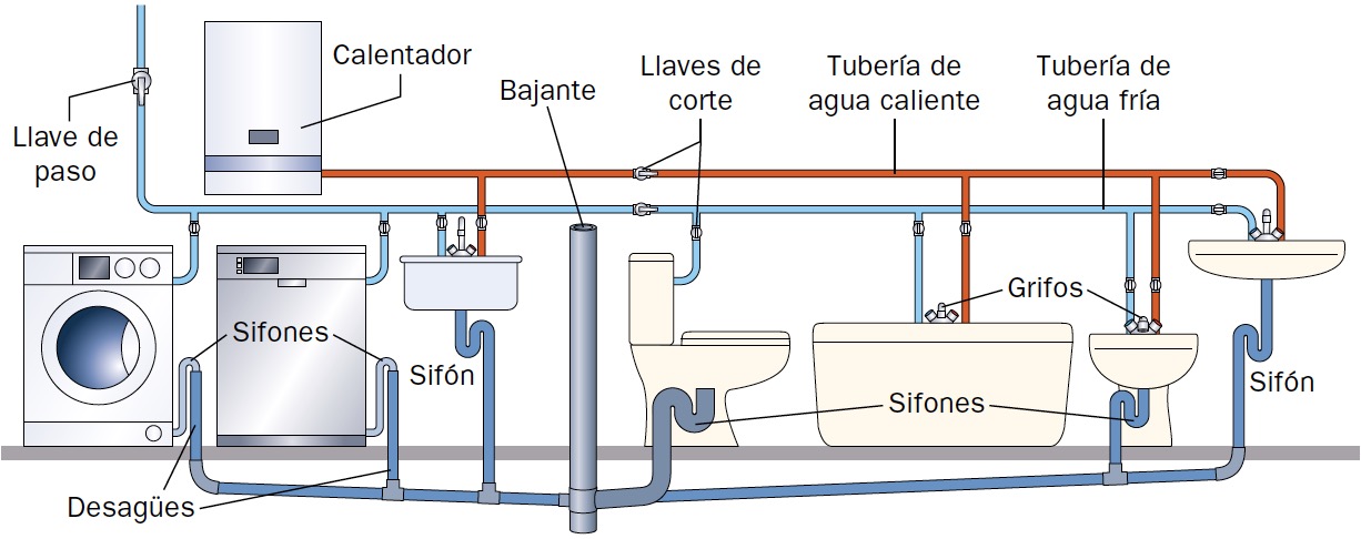 - Red de saneamiento: está compuesta por tuberías de mayor diámetro que las anteriores y saca el agua de las viviendas tras su uso.
