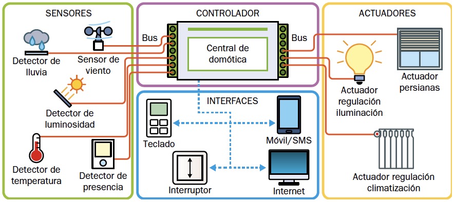 Los sensores son los encargados de detectar los cambios que se producen en el medio y mandar la información al controlador, que a su vez la envía a la interfaz para que el usuario decida qué acción realizar. Si hemos automatizado el sensor (por ejemplo, apagar la luz cuando la luminosidad sea suficiente), enviará la orden directamente al actuador.