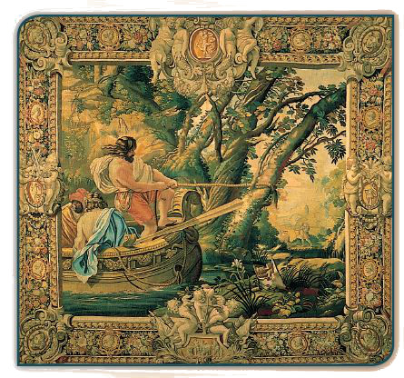 Font 10. El desembarcament d'Ulisses a l'illa de Calipso, segons un tapís francès del segle XVIII basat en una pintura de Simon Vouet.