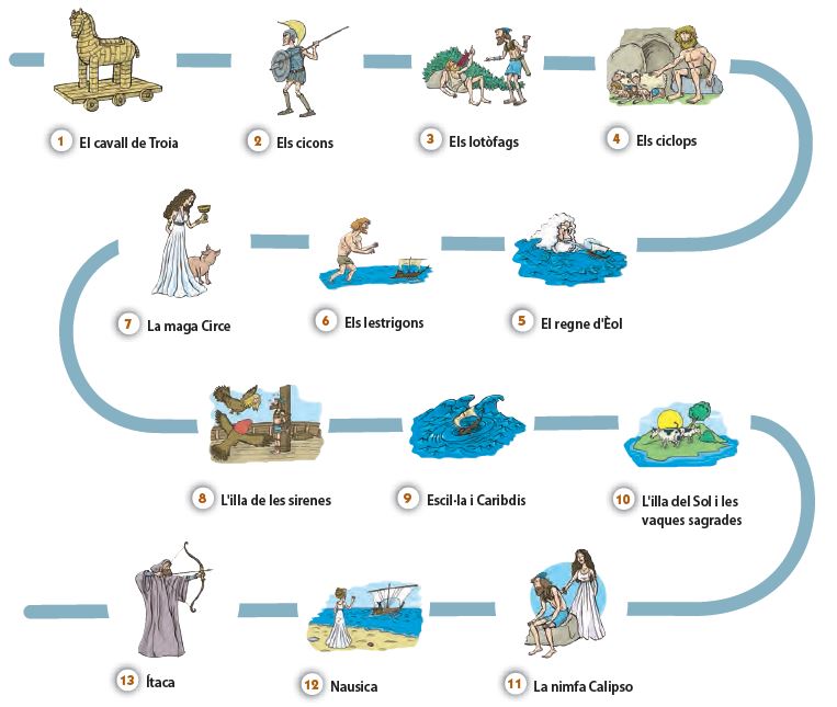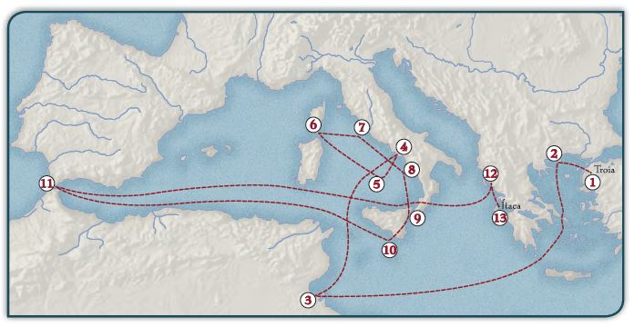 El recorregut de Troia fins a Ítaca no sembla llarg en un mapa, però llavors era una travessia plena de perills, i Ulisses en va veure de tots colors, perquè les divinitats li tenien reservat un retorn llarg i ple d'infortunis. [Font 4]