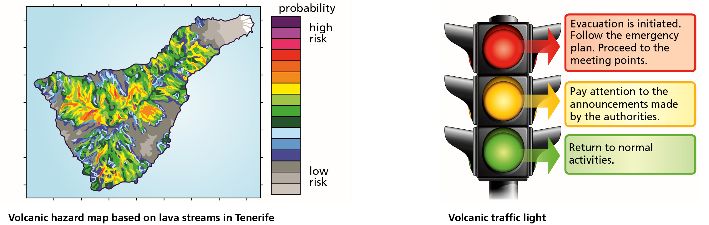 • Planning before emergencies increases the capacity of the population to respond and the methods of self-protection against earthquakes and volcanic eruptions. In the case of volcanoes, the most adequate measure is to plan evacuation of risk zones before the eruption. For this, there are three levels of alert, represented in the form of a traffic light.