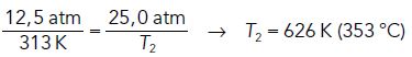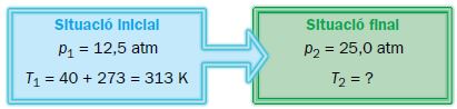 Una bombona que conté un cert gas té un volum de 50 dm3 . A 25 °C, la pressió que suporten les parets de la bombona és de 2,9 atm. Quina pressió exercirà el gas si es duplica la temperatura?