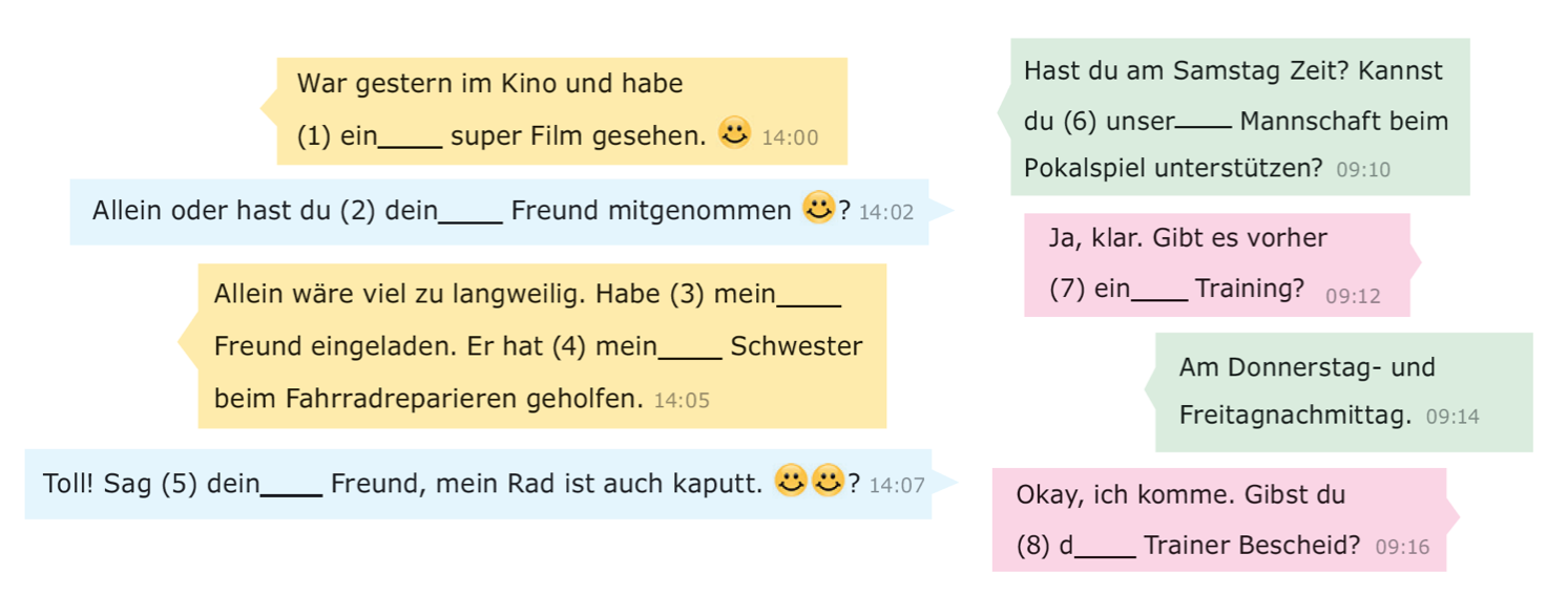 A: Allein wäre viel zu langweilig. Habe (3) mein Freund eingeladen. Er hat (4) mein Schwester beim Fahrradreparieren geholfen.