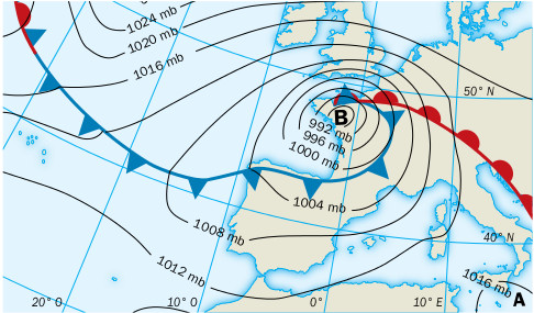 - En los mapas del tiempo, la presión se suele expresar en hectopascales, hPa, y hasta hace poco, en milibares, mb. Dibuja el mapa inferior en tu cuaderno con los valores de la presión en hPa.