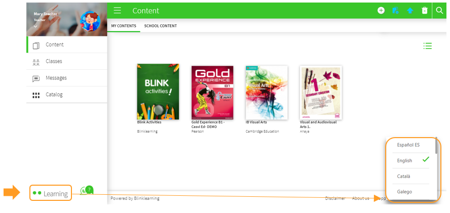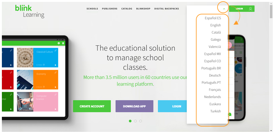 Go to https://www.blinklearning.com and click on the language drop-down menu in the top navigation bar to see the list of available languages. Select the one you want to change and reload the page to see the new language.