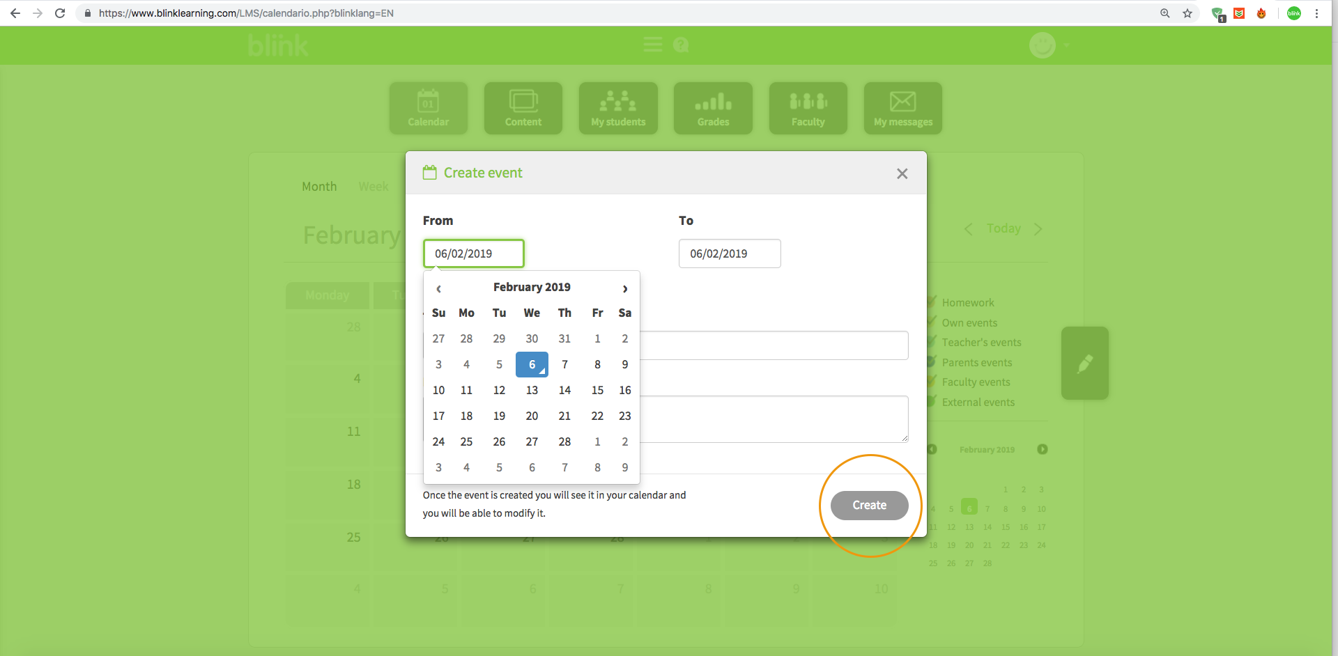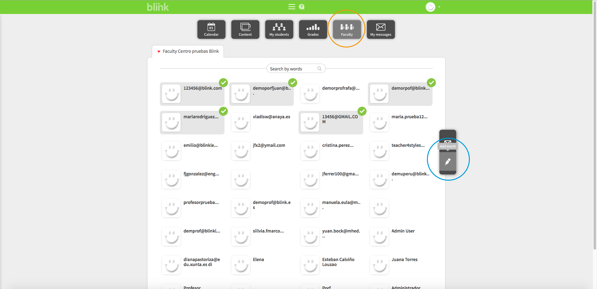 Faculty events refer to events you schedule with other teachers from your school and appear in both yours and in the calendars of the teachers from your school that you select (if you do not select any, the event will be marked for everyone). To create a Faculty event, access the FACULTY tab and click on "Add event".